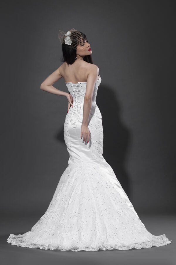 Brigitte Bardot é uma atriz e cantora francesa. Conhecida mundialmente, é considerada o grande símbolo de beleza dos anos 50 e anos 1960. Sinônimo de sensualidade, prestamos uma homenagem à essa incrível mulher com um modelo outwear em uma estética lingerie. Esta é a versão noiva do modelo Brigitte Bardot com saia modelo sereia. Vestido com aplicações em renda e aplicação de brilhos.